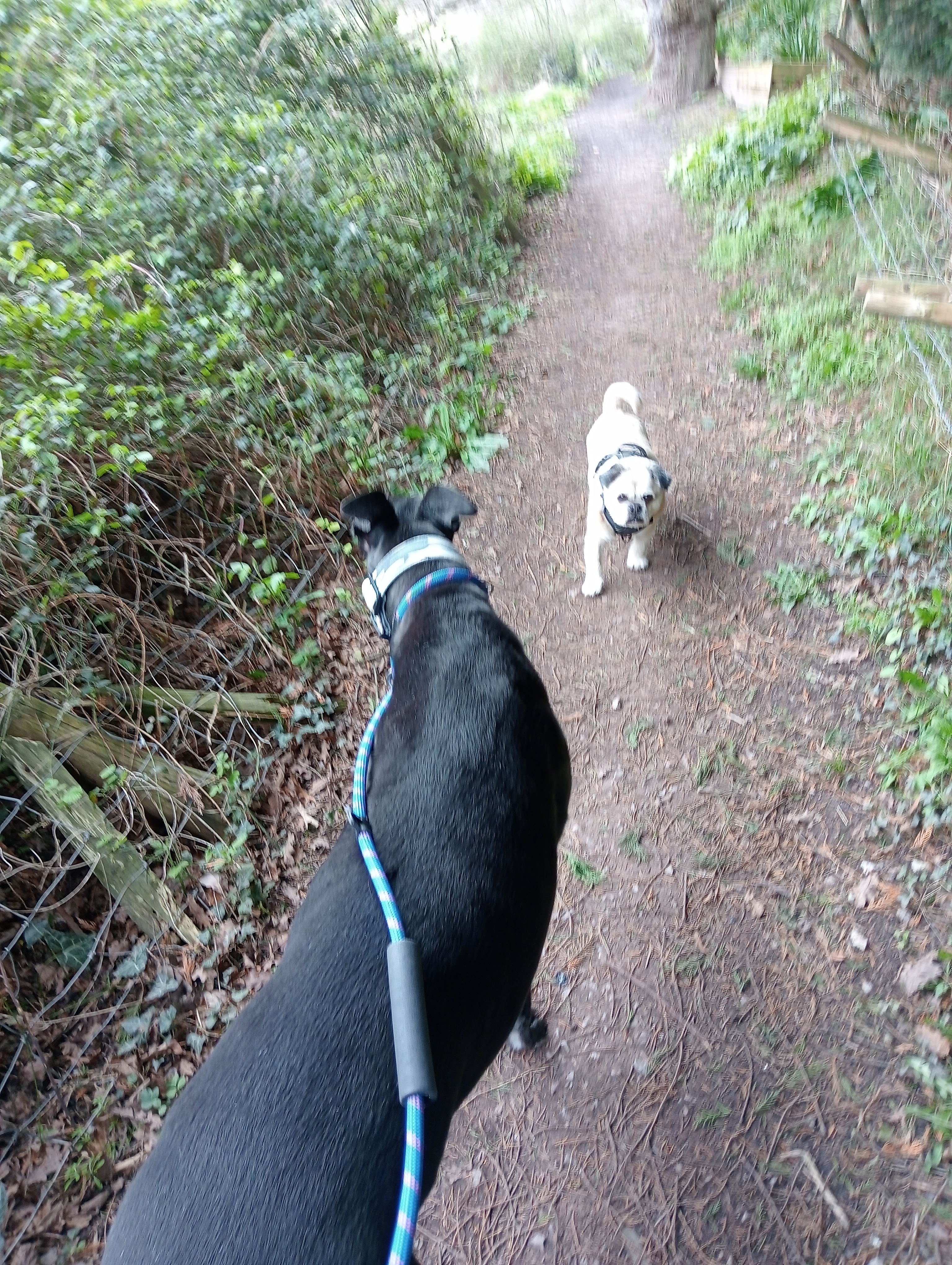 My little dog, Renly, and Mikey the greyhound who I walk twice a week. Photographed 25th March 2024 by myself. Both dogs but both not only very different in size but in temperament. Mikey is very nervy and scared of his own shadow whereas Renly would take on the world