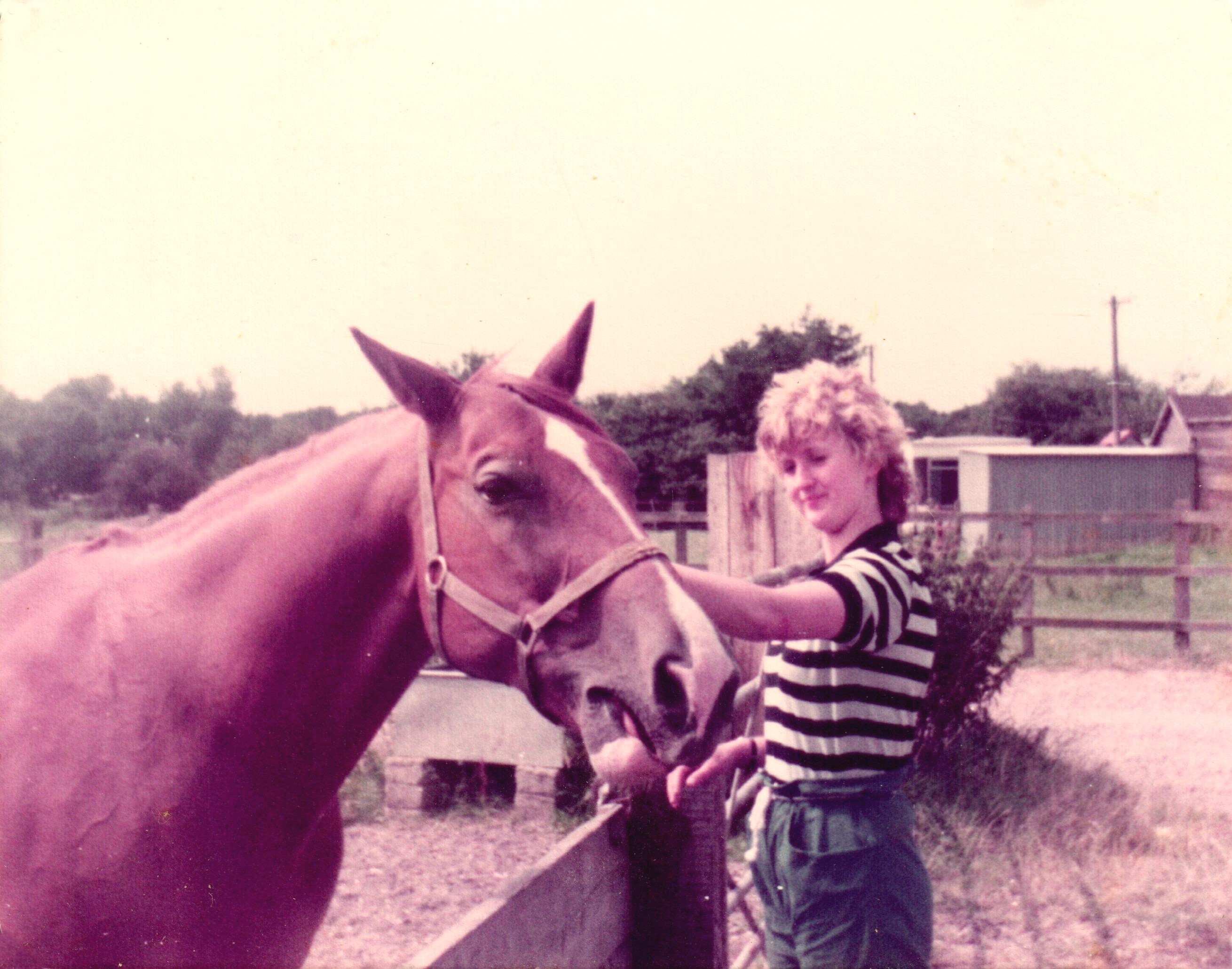 Photograph of my sister doing what she loved best, being with horses, probably over 30 years ago!